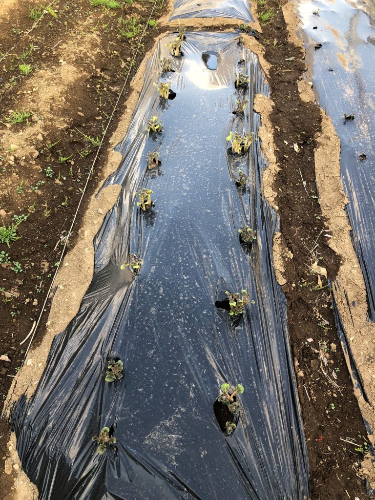 ジャガイモの芽が出て、マルチを押し上げています。押し上げた部分のマルチを切って、芽を外に出させるわけですが、ちょっと困りました。男爵イモの方は、勢いよく芽が伸びているので、簡単にマルチの穴あけはできたのですが、半分に切って植え付けたメイクイーンの方は、芽の出方が弱く、押し上げている部分に穴をあけてみるとスギナだったりで、ジャガイモの芽を探すのが一苦労でした。また一部、芽が出ず腐ってしまった種芋もあり、歩留まりがよろしくない状況です。今後、大きく成長するのかどうか見守りたいと思います。